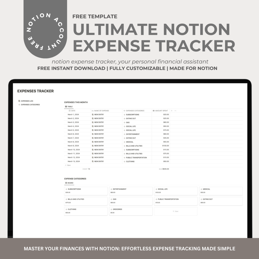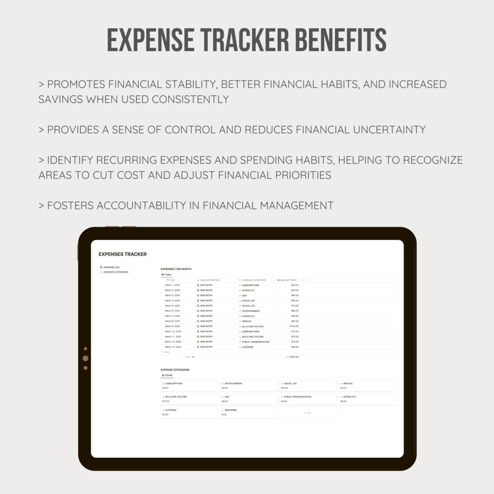 Revolutionize your financial life with this extremely helpful and user-friendly expense tracker. This expense tracker will allow you to track all your bills and expenses, while simultaneously breaking all your expenses into different categories. This allows you to see where all your money's going! Start your financial journey today! If you enjoy this free template, check out all our other Notion and Google Sheets templates as well!