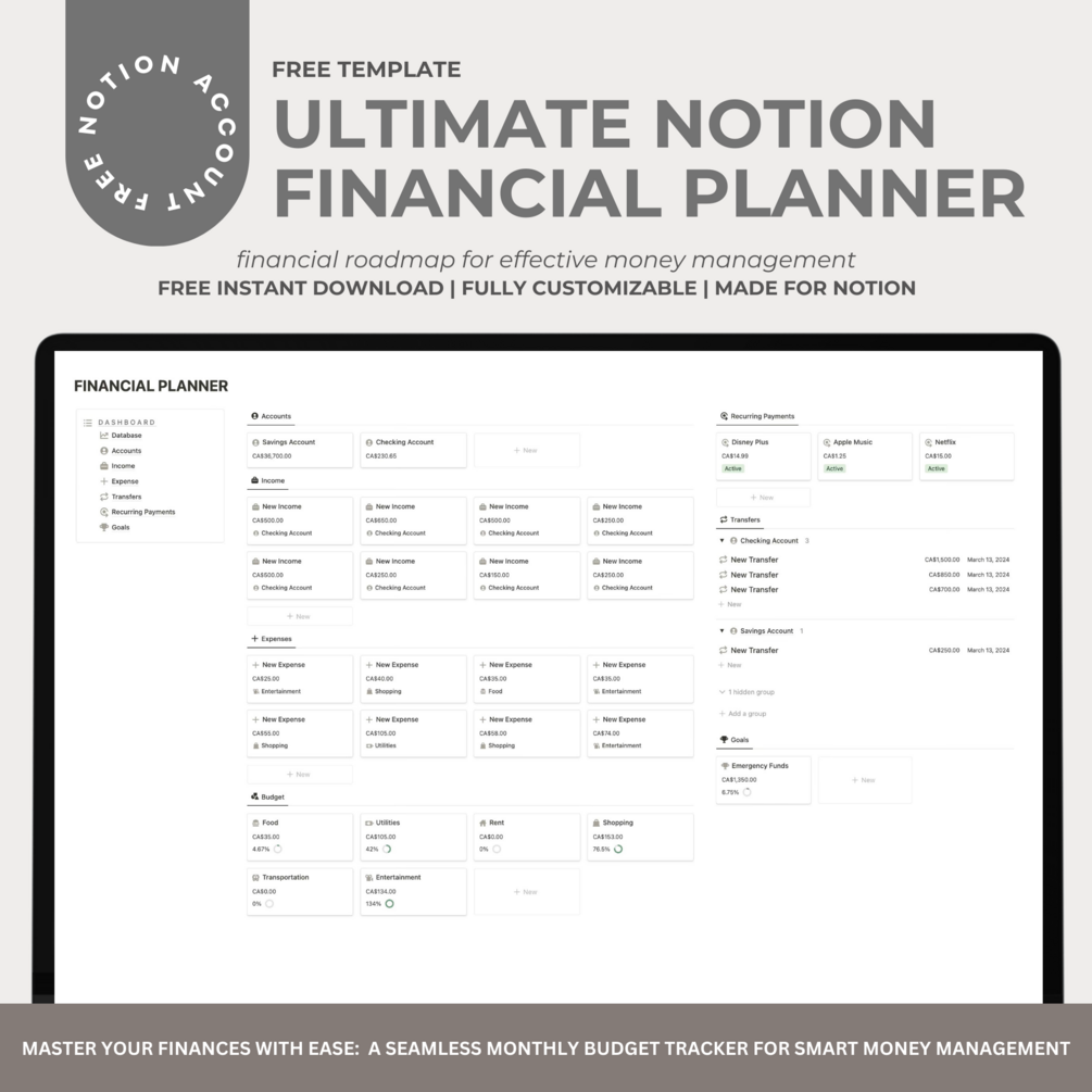 Turn your financial situation 180 degrees with our simple and user-friendly financial planner! Track your income, expenses, transfers, subscriptions and more! See where all your money is going and reach your financial goals today! If you enjoy this free template, check out all our other Notion and Google Sheets templates as well!